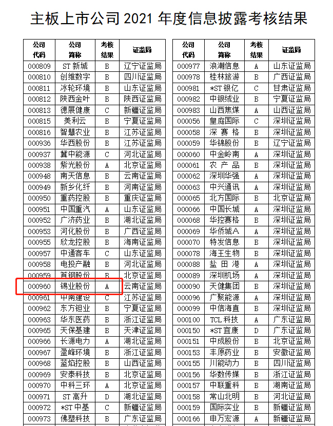7月4日,深圳證券交易所發布了《2021年度上市公司信息披露考核結果》,錫業股份(000960)考核評價結果為最高等級A級,自2017年之后再次回到信息披露考核最高等級陣營。從考核結果統計來看,深市上市的2,553家公司中考核結果為A(優秀)的公司家數僅為454家,占參加考核上市公司總數的17.78%。其中,云南轄區考核結果為A的深市上市公司僅有5家。