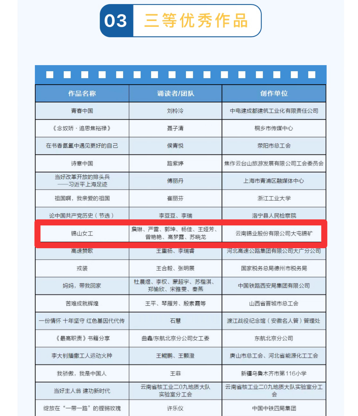 11月10日,由中華全國總工會、中央網信辦主辦,全國職工書屋承辦的2022年“網聚職工正能量 爭做中國好網民”主題活動之“閱讀經典好書 爭做中國好網民”主題誦讀比賽活動榜單揭曉。由云錫控股公司工會選送的參賽作品《錫山女工》經過層層遴選,在全國近3000部參賽作品中脫穎而出,通過線上展示、網絡投票和專家評審,成功入圍全國百強作品并榮獲三等獎。云錫控股公司是云南省省屬企業中唯一的獲獎單位。