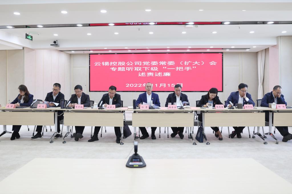 11月15日,云錫控股公司黨委常委會召開(擴大)會議,開展下級“一把手”述責述廉、接受評議工作。控股公司黨委書記、董事長孫勇主持會議并講話。