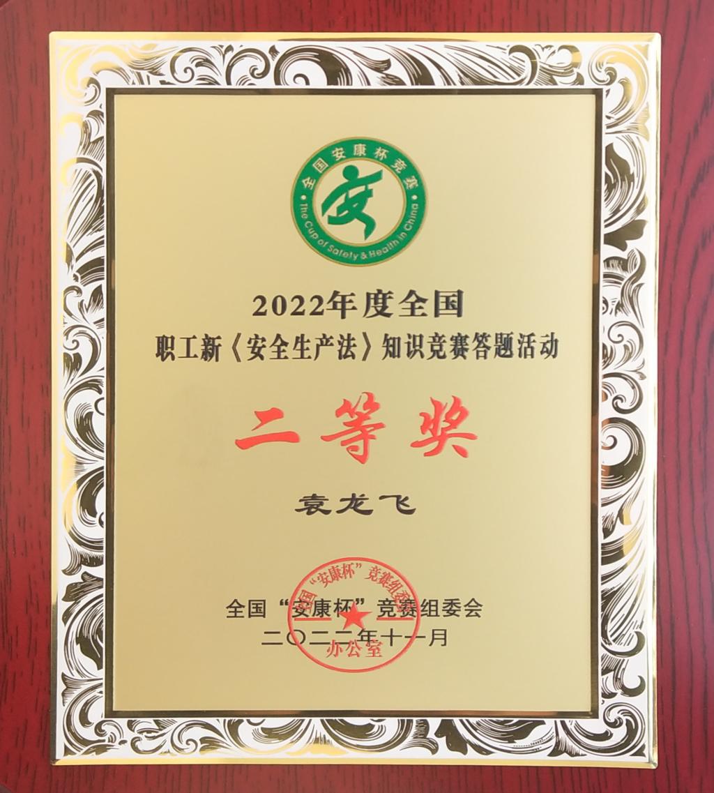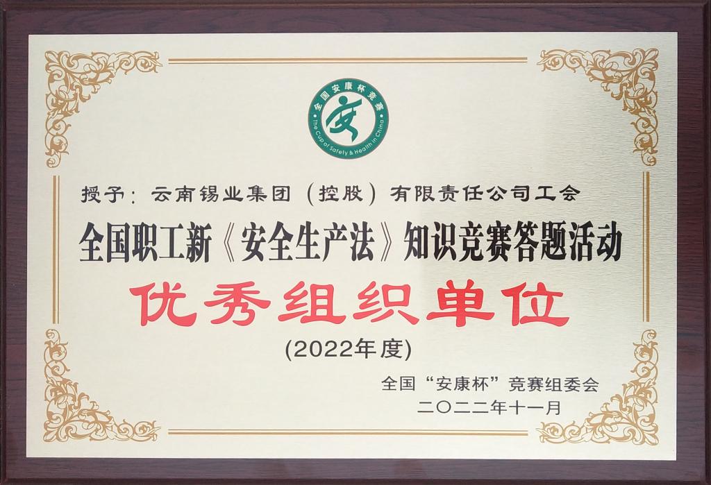 經(jīng)云南省總工會推薦,全國“安康杯”競賽組委會審核,控股公司工會獲全國職工新《安全生產(chǎn)法》知識競賽答題“優(yōu)秀組織單位”榮譽稱號,是云南省的7個獲獎單位之一,是云南省屬企業(yè)工會中的唯一獲獎單位。另外,錫化工公司職工袁龍飛榮獲知識競賽答題活動個人“二等獎”。