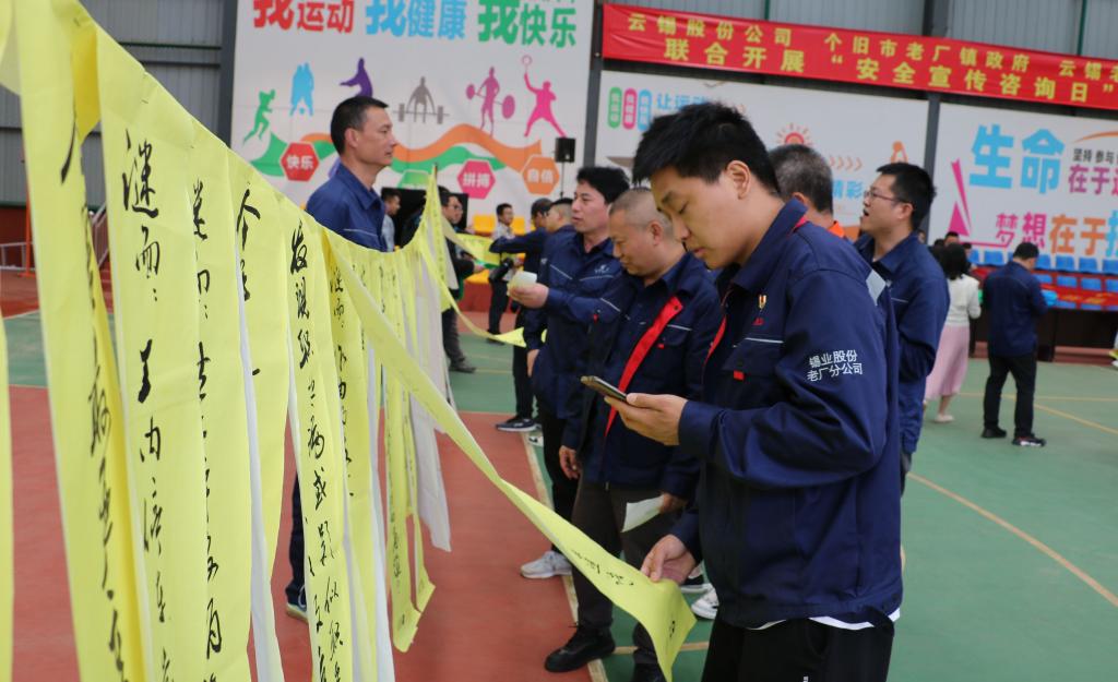 錫業股份、老廠分公司、個舊市老廠鎮在分公司職工體育活動中心聯合組織開展了“安全宣傳咨詢日”活動。活動通過擺放展板、發放宣傳資料及防災減災科普知識資料、安全知識競猜等形式開展安全生產法律法規、安全科普常識及安全生產知識方面的宣傳,參加活動的人員還共同觀看了《“安全生產月”公益宣傳片、井下火災逃生要點科普片》,在“人人講安全,個個會應急”活動主題橫幅上進行了簽字。通過“安全宣傳咨詢日”活動,進一步提高干部職工的安全法律法規意識。(李偉華)