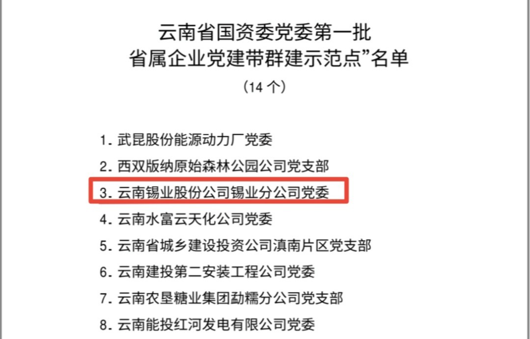 近日,云南省國資委黨委辦公室發布了《云南省國資委黨委關于命名第一批“省屬企業黨建帶群建示范點”的決定》,云錫錫業分公司黨委成功入選云南省國資委黨委第一批“省屬企業黨建帶群建示范點”名單。
