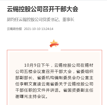 李朝文宣讀中共云南省委文件:省委常委會決定,胡均任云南錫業(yè)集團(控股)有限責任公司黨委委員、常委、書記;省政府黨組、省委常委會同意,胡均任云南錫業(yè)集團(控股)有限責任公司董事長。