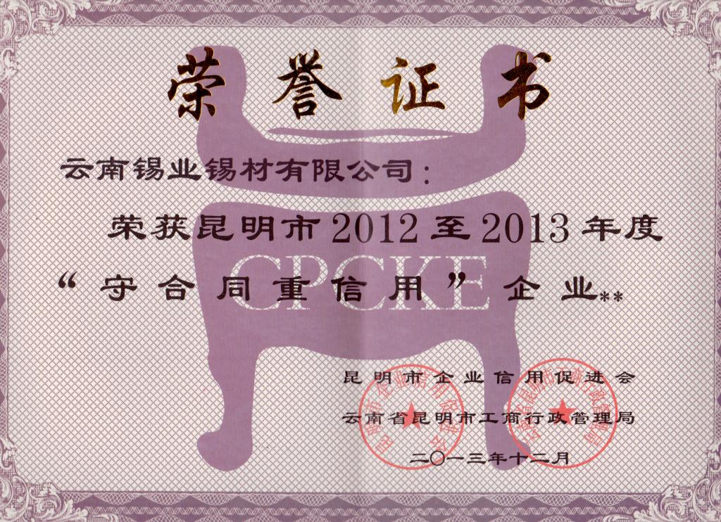 3月25日,錫材公司再次被評為昆明市2012至2013年度“守合同 重信用”企業(yè)。自2006年開始,錫材公司已連續(xù)8年得到了昆明市工商局、昆明市企業(yè)信用促進會的認可。