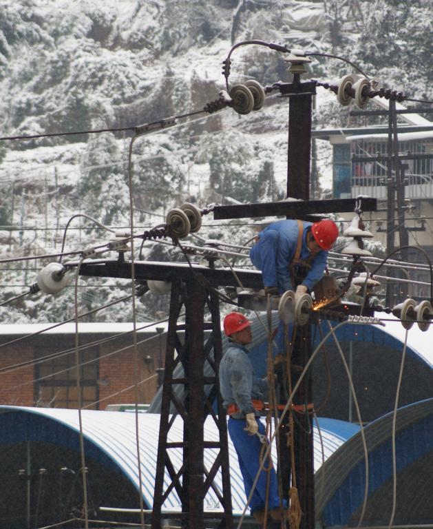 停電直接導(dǎo)致供水公司市區(qū)凈化站、乍甸提水系統(tǒng)無法運(yùn)行,供水公司東西村家屬區(qū),機(jī)關(guān)和馬礦片區(qū)及周邊部分社區(qū)停電。針對市區(qū)凈化站、乍甸提水系統(tǒng)無法運(yùn)行,供水公司積極協(xié)調(diào)白云溝、壩堵寨水源組織生產(chǎn),增加新冠、技校兩個凈水站的供水量,全力確保云錫冶煉廠生產(chǎn),醫(yī)院、學(xué)校等重點(diǎn)單位及居民生活用水的正常供給。與此同時受損線路搶修也風(fēng)雪中展開,搶修人員不顧雨雪登桿接線,密密麻麻的雨雪打濕了全身,風(fēng)雪中藍(lán)色的工作服和紅色的安全帽分外顯眼。