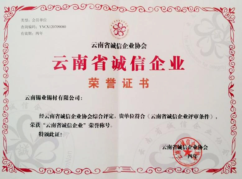 5月22日,錫材公司被云南省誠信企業協會授予“云南省誠信企業”稱號。