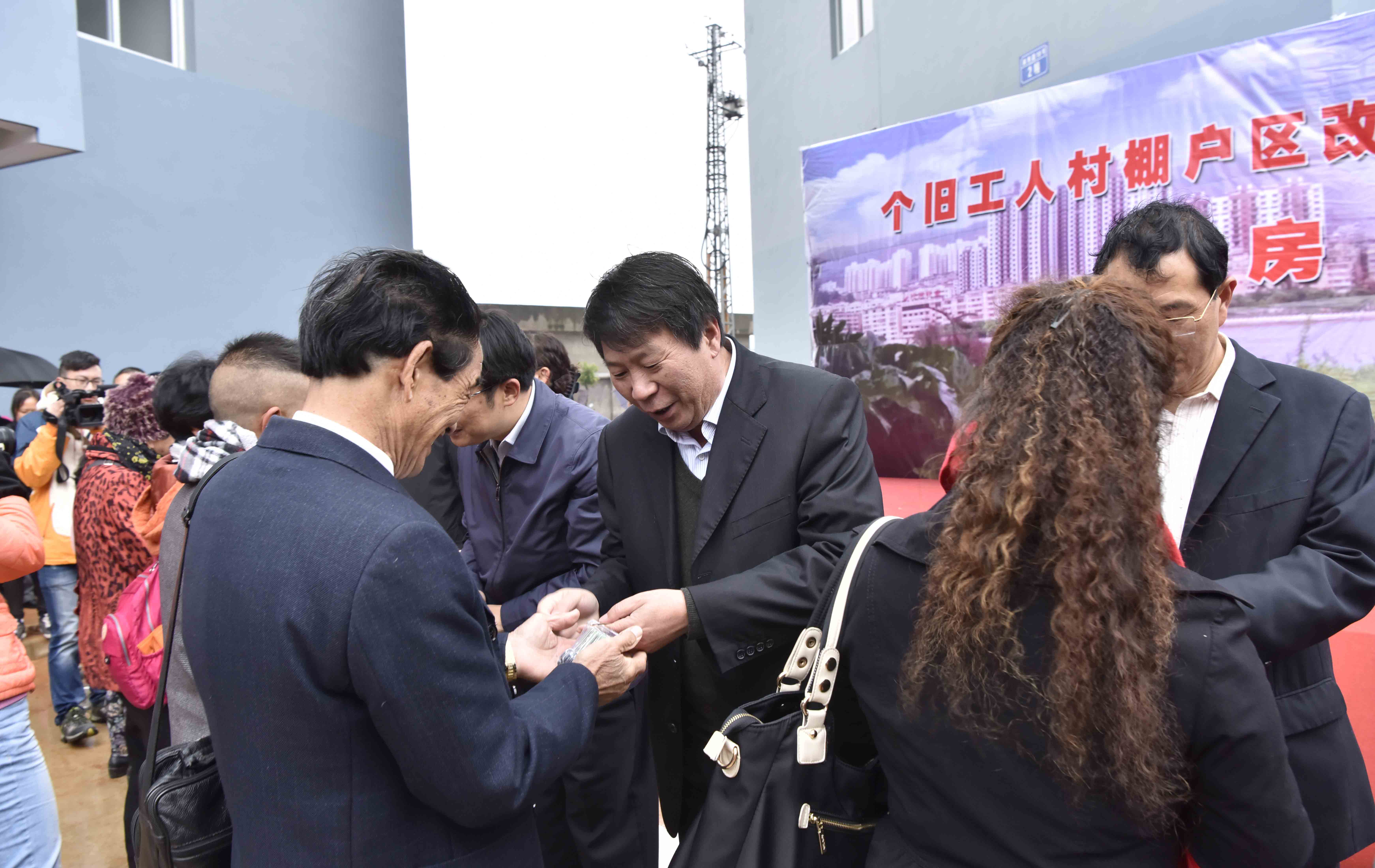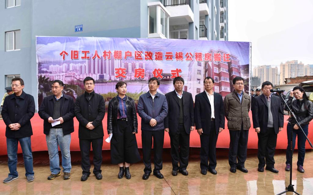11月26日,個(gè)舊市工人村棚戶區(qū)改造云錫公租房交房?jī)x式在鄢棚南路69號(hào)公租房區(qū)進(jìn)行。云錫控股公司黨委書(shū)記、董事長(zhǎng)張濤,黨委副書(shū)記、副董事長(zhǎng)、總經(jīng)理李剛,省國(guó)資委派駐云錫監(jiān)事會(huì)主席單治光,副總經(jīng)理程睿涵、劉凡云,控股公司副董事長(zhǎng)、錫業(yè)股份總經(jīng)理?xiàng)钷让?,以及紅河州委副書(shū)記、宣傳部長(zhǎng)盛高舉,個(gè)舊市委書(shū)記羅萍、個(gè)舊市政府市長(zhǎng)趙剛、副市長(zhǎng)李開(kāi)云為搬遷住戶發(fā)放公租房鑰匙。個(gè)舊市住建局和云錫控股公司有關(guān)部門和單位的負(fù)責(zé)人及部分搬遷戶主出席儀式。