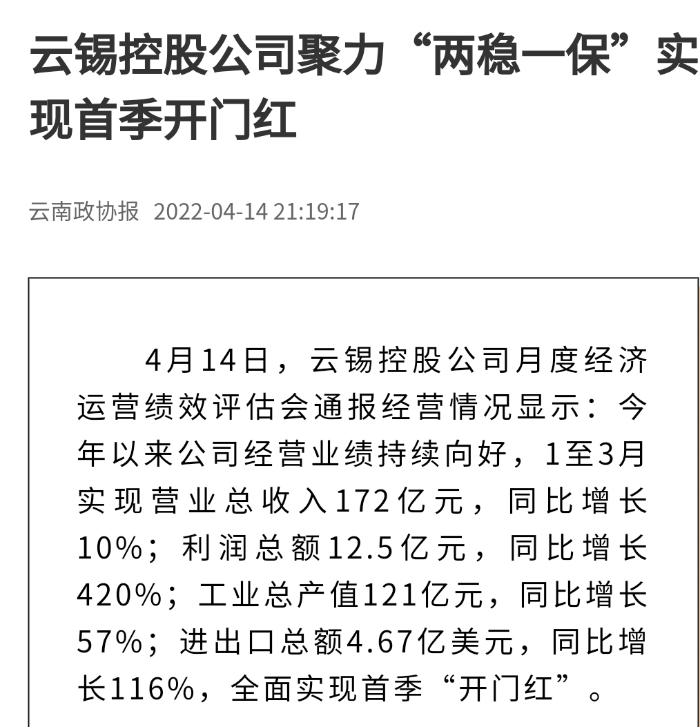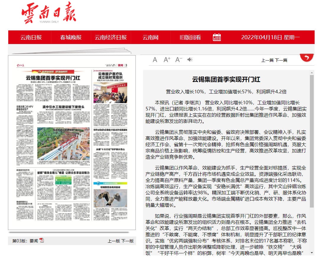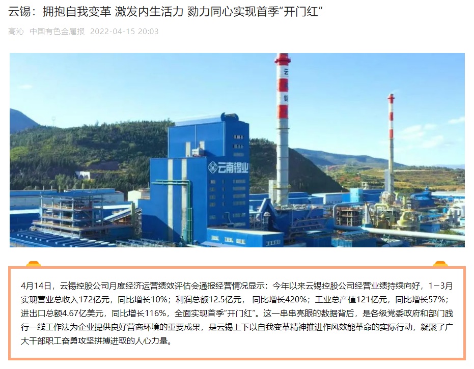 媒體關(guān)注| 人民網(wǎng)、新華財經(jīng)、云報、云南國資等媒體關(guān)注云錫實現(xiàn)首季開門紅