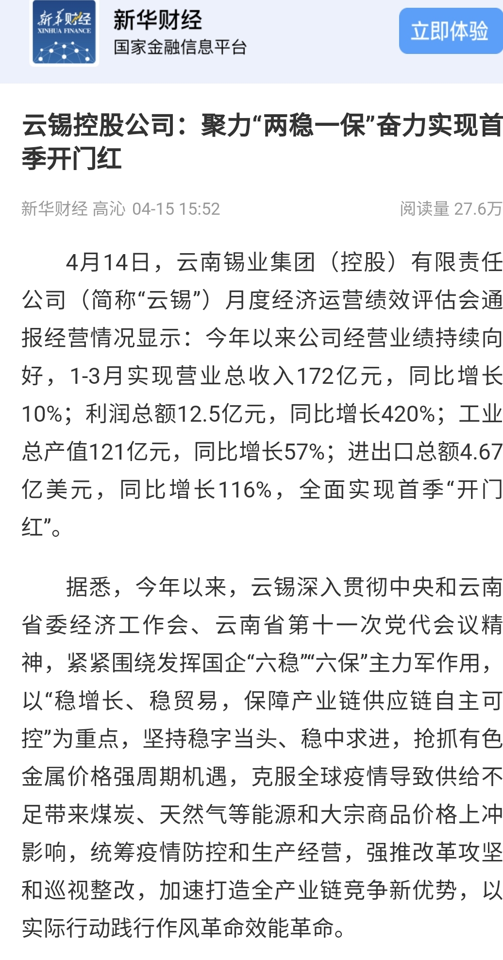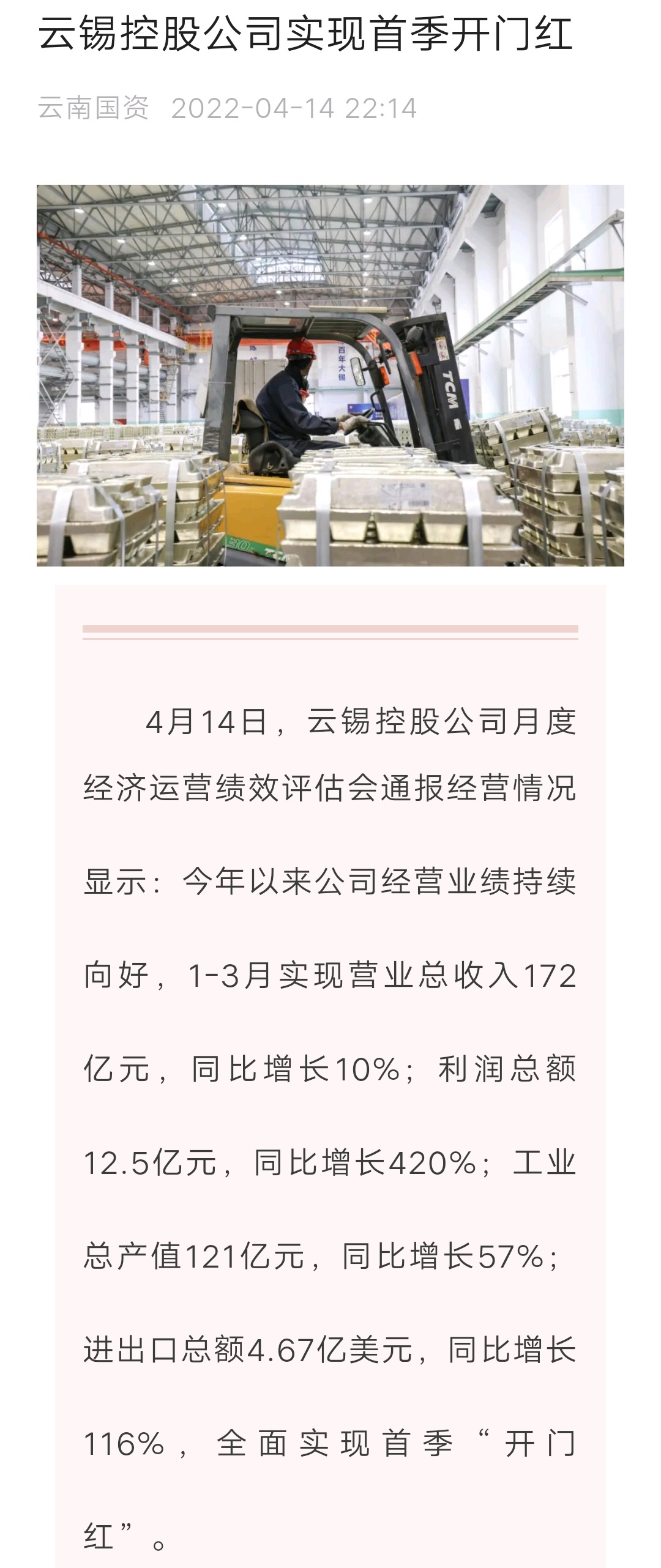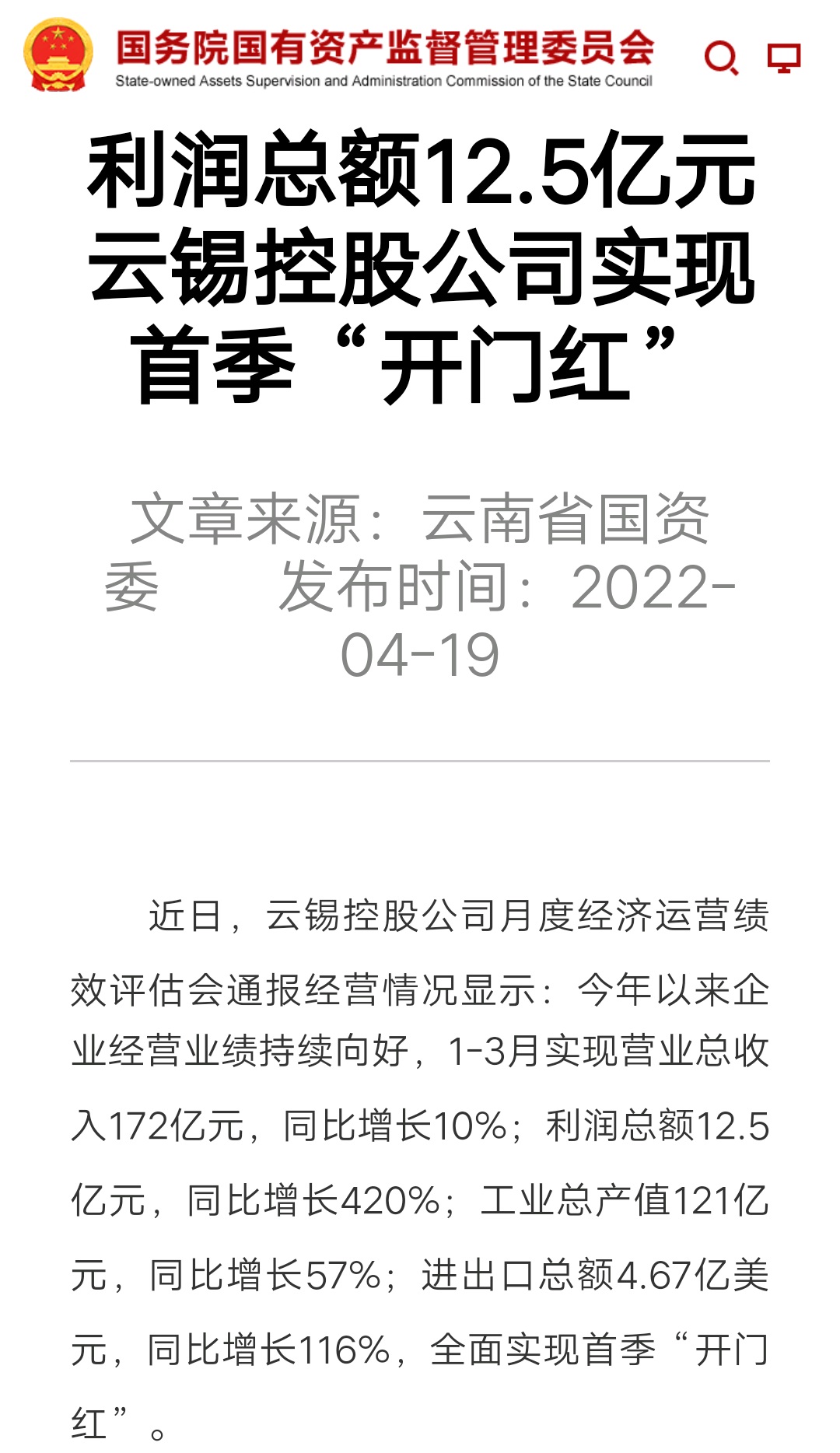 媒體關(guān)注| 人民網(wǎng)、新華財經(jīng)、云報、云南國資等媒體關(guān)注云錫實現(xiàn)首季開門紅