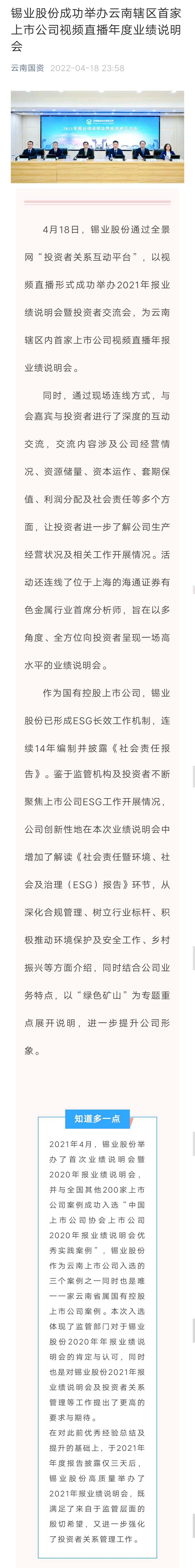 云南國資:錫業股份成功舉辦云南轄區首家上市公司視頻直播年度業績說明會