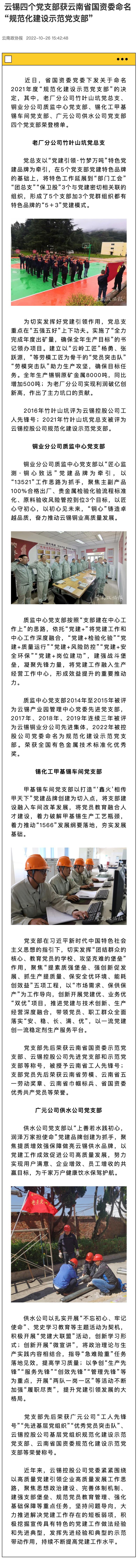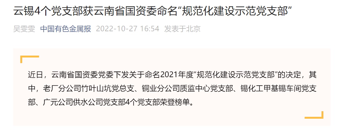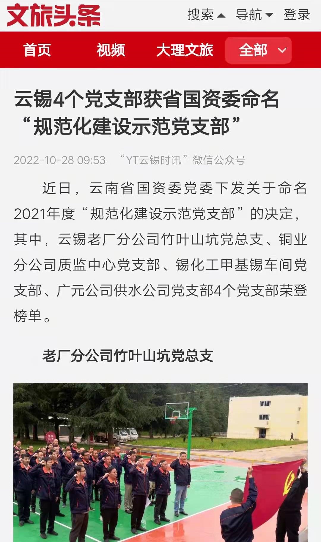 云南政協(xié)報(bào)、中國(guó)有色金屬報(bào)、文旅頭條:云錫四個(gè)黨支部獲云南省國(guó)資委命名“規(guī)范化建設(shè)示范黨支部”