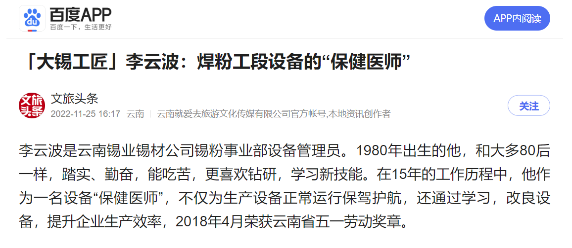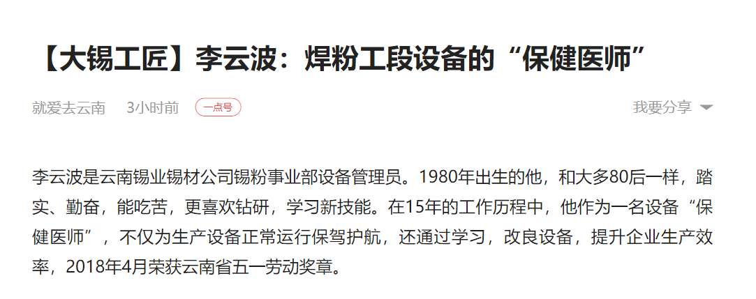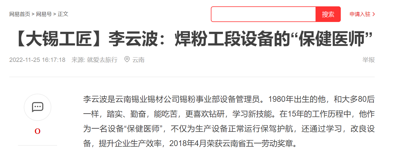 今日頭條、網易、一點資訊、百度、文旅頭條:【大錫工匠】李云波:焊粉工段設備的“保健醫師”