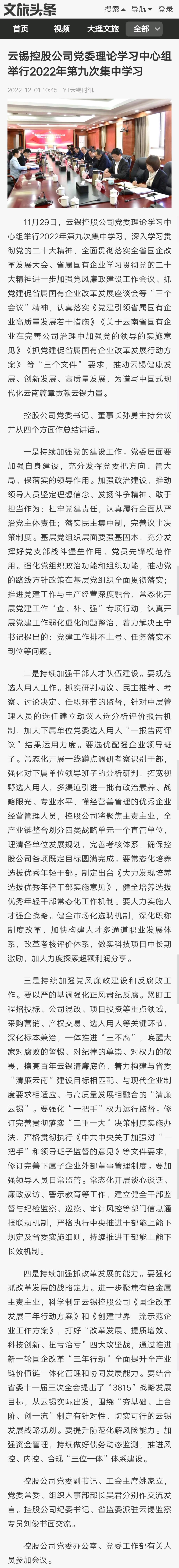 文旅頭條:云錫控股公司黨委理論學習中心組舉行2022年第九次集中學習