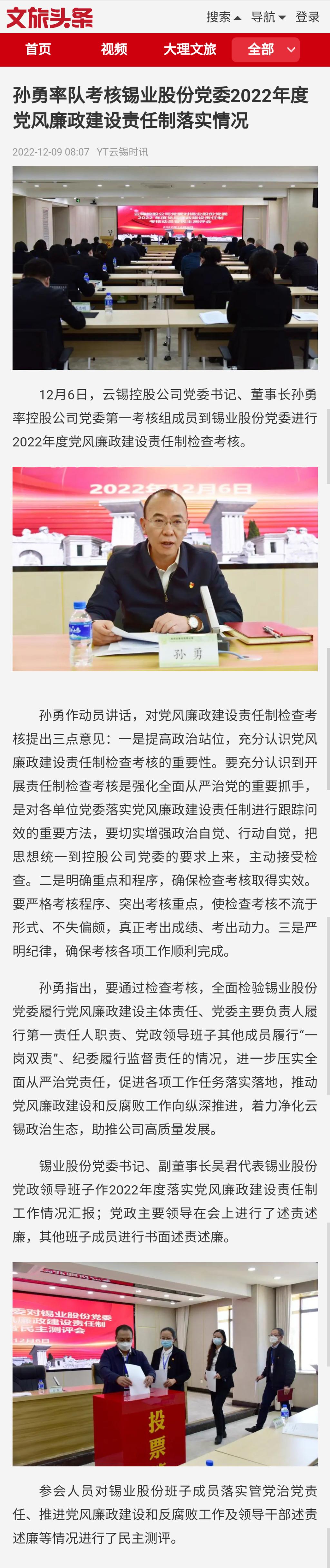 文旅頭條:孫勇率隊考核錫業股份黨委2022年度黨風廉政建設責任制落實情況
