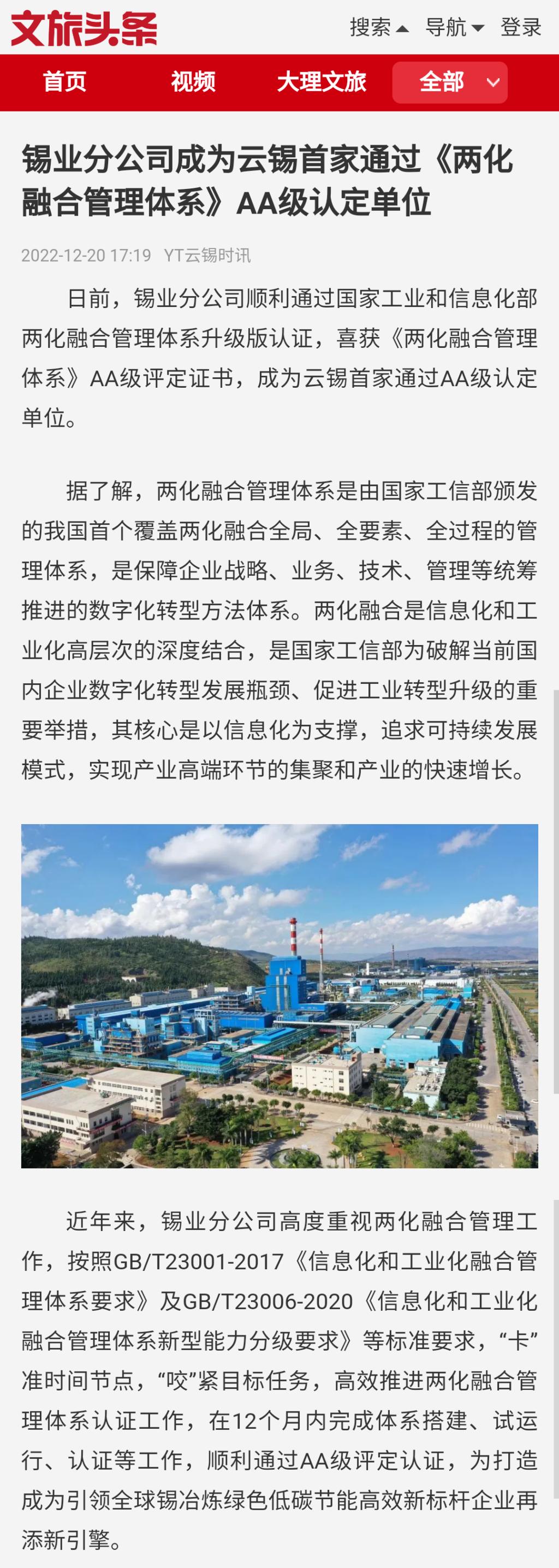 文旅頭條:錫業(yè)分公司成為云錫首家通過(guò)《兩化融合管理體系》AA級(jí)認(rèn)定單位