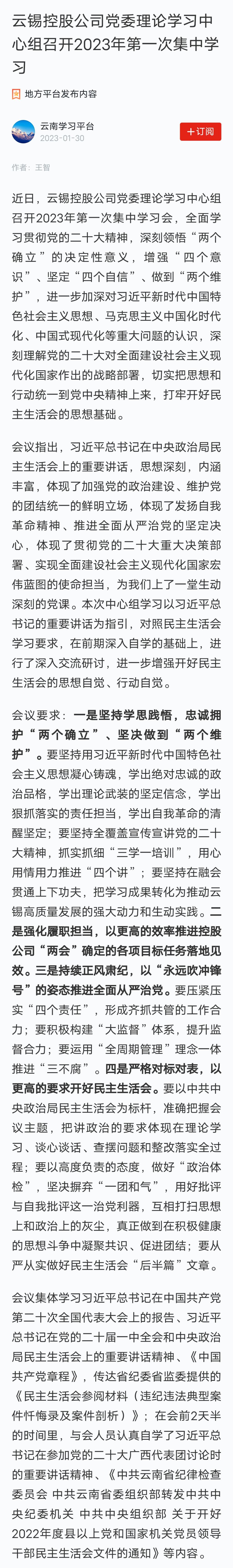 學習強國:云錫控股公司黨委理論學習中心組織召開2023年第一次集中學習