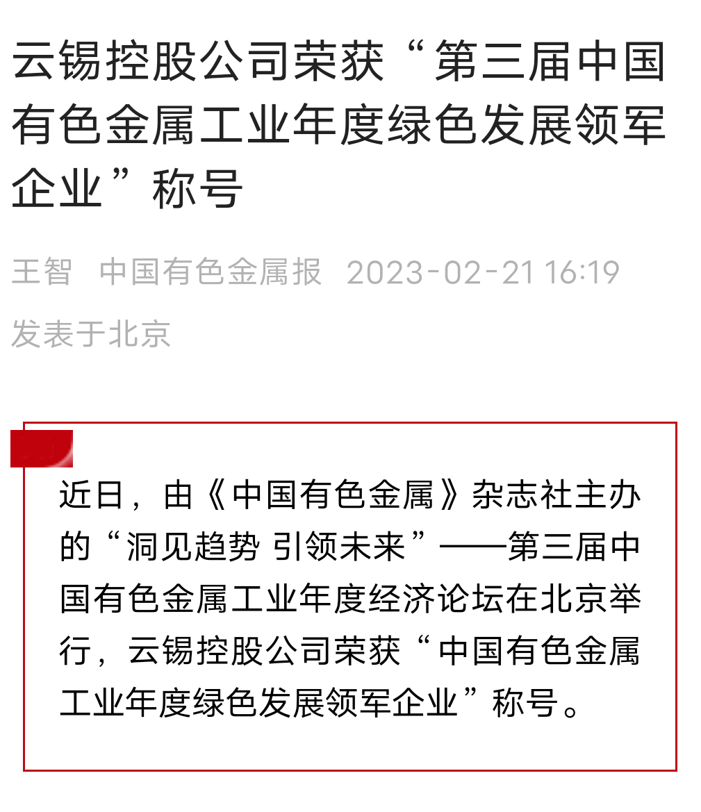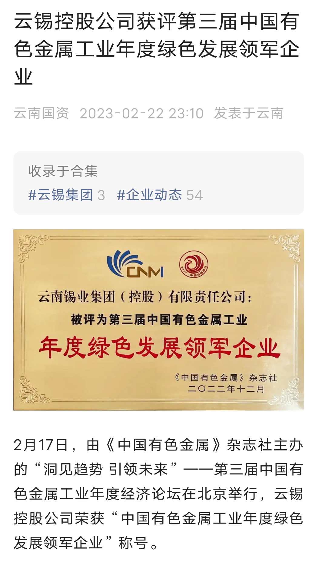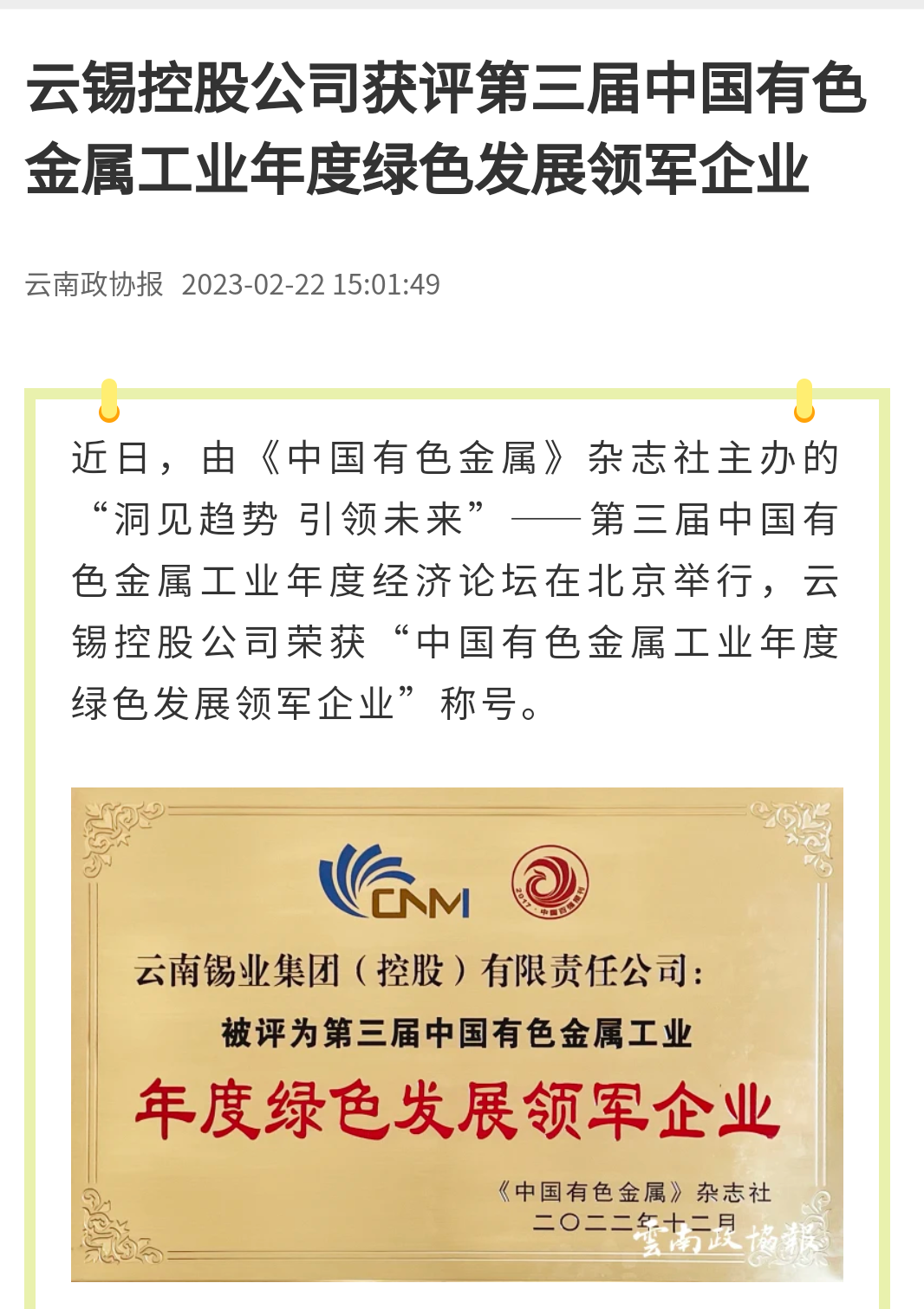 云南國資、云南政協報、中國有色金屬報、文旅頭條:云錫控股公司榮獲“第三屆中國有色金屬工業年度綠色發展領軍企業”稱號
