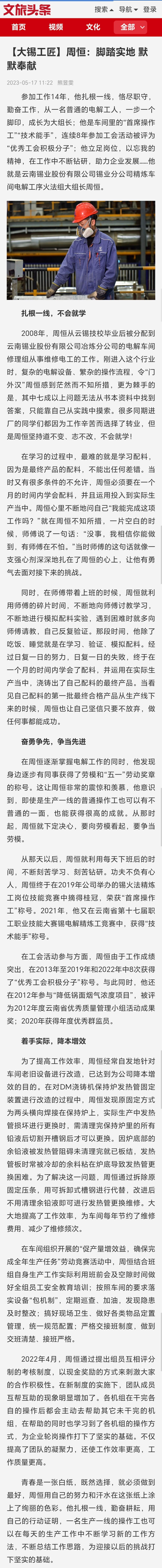 文旅頭條:【大錫工匠】周恒:腳踏實地 默默奉獻