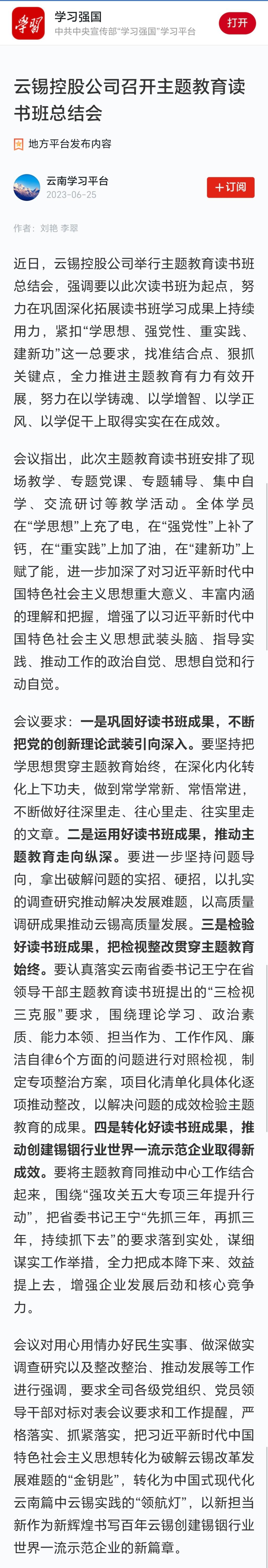 學(xué)習(xí)強國:云錫控股公司召開主題教育讀書班總結(jié)會