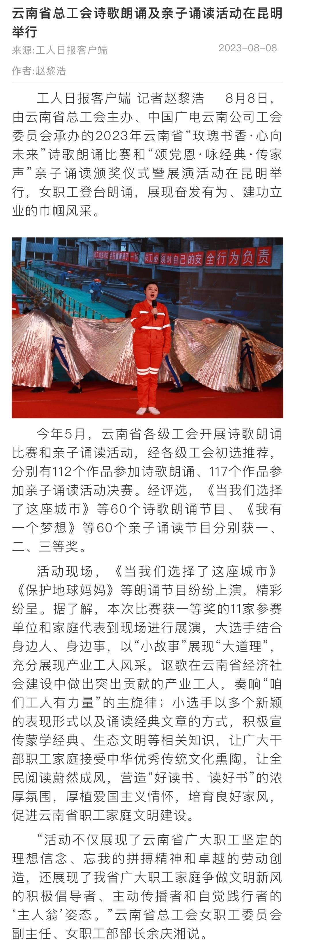 云南省總工會詩歌朗誦及親子誦讀活動新聞在工人日報發布,使用的唯一一張照片是卡房分公司詩歌朗誦節目《錫山薔薇》的現場展示劇照。云錫控股公司工會選送的卡房分公司的《錫山薔薇》、銅業分公司的《銅業之光》榮獲“玫瑰書香·心向未來”詩歌朗誦比賽一等獎,控股總部職工楊曉艷家庭的《詩詞里的生活》和錫業分公司職工王陽靜倩家庭的《綠建未來 綠美中國》榮獲“頌黨恩·詠經典·傳家聲”親子誦讀比賽二等獎。