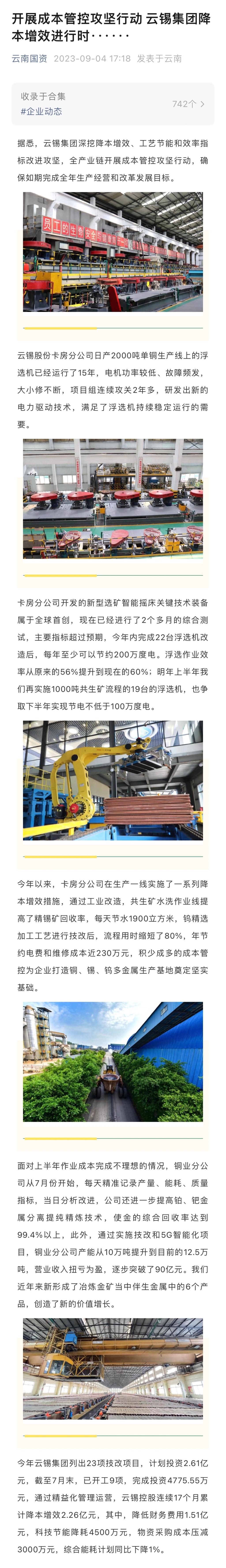 云南國資:開展成本管控攻堅行動 云錫集團降本增效進行時