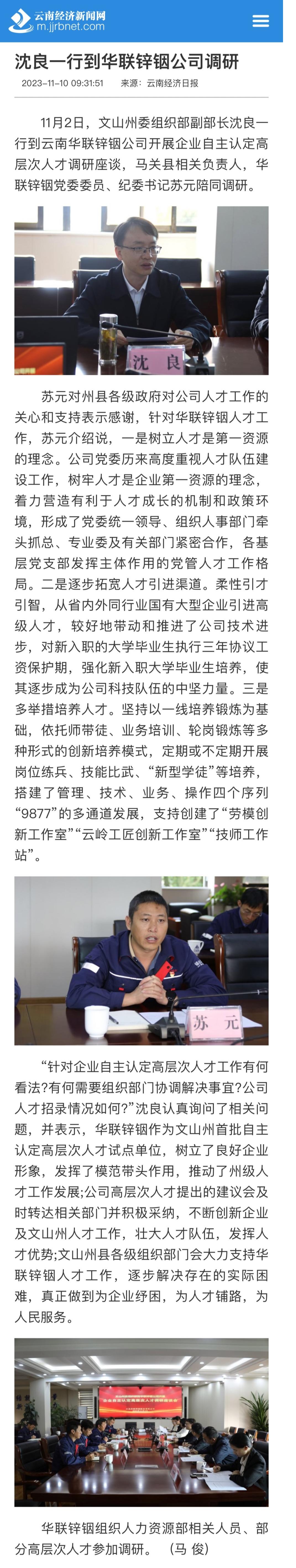 云南經(jīng)濟日報:沈良一行到華聯(lián)鋅銦公司調(diào)研