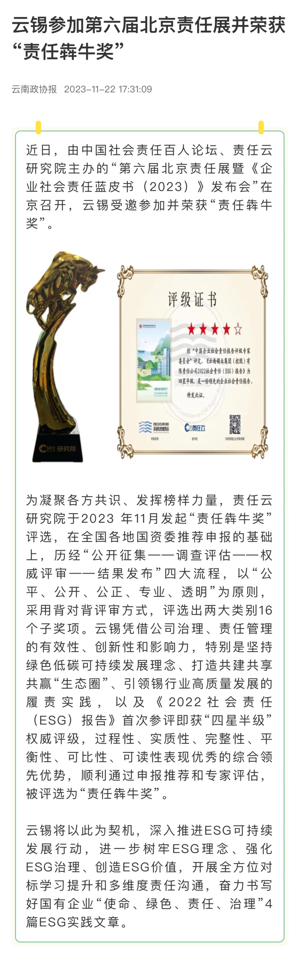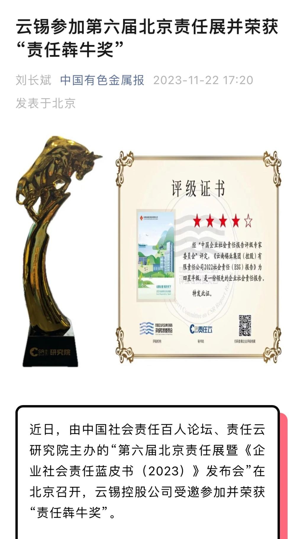 云南政協報、中國有色金屬報:云錫參加第六屆北京責任展并榮獲“責任犇牛獎”
