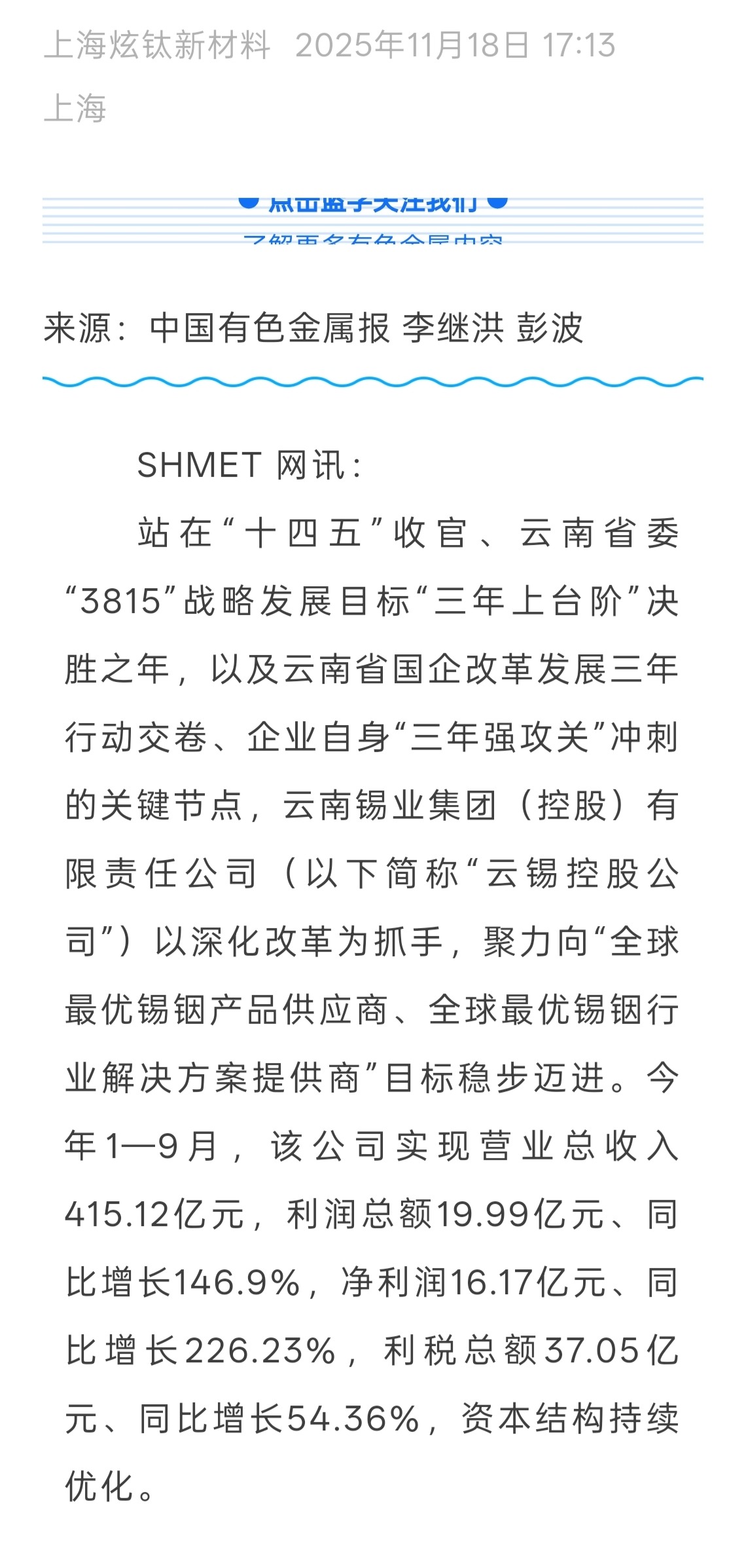 站在“十四五”收官、省委“3815”戰略發展目標“3年上臺階”決勝之年、全省國企改革發展三年行動交卷、云錫自身“三年強攻關”沖刺的關鍵節點,云南錫業集團(控股)有限責任公司正以深化改革為抓手,聚力向“全球最優錫銦產品供應商、全球最優錫銦行業解決方案提供商”穩步邁進。2025年1至9月,云錫控股實現營業總收入415.12億元、利潤總額19.99億元,同比增長146.9%;凈利潤16.17億元,同比增長226.23%;利稅總額37.05億元,同比增長54.36%,資本結構持續優化。
