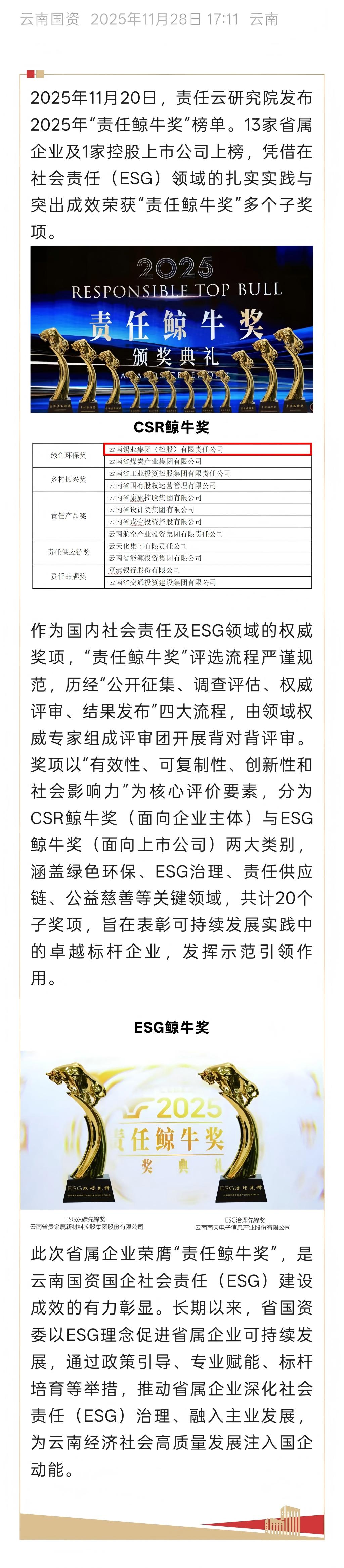 云南國資:厚植責任底色 彰顯國企擔當 省屬企業可持續發展再獲殊榮